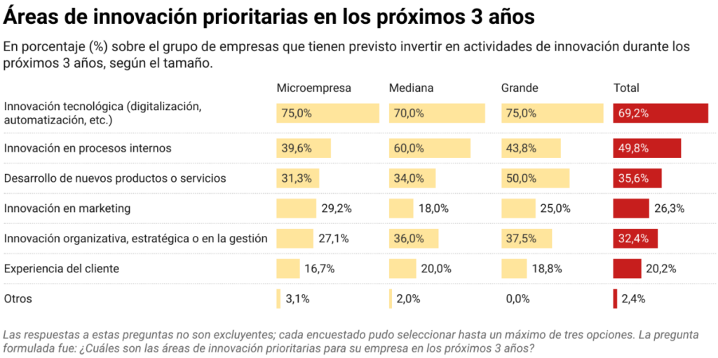 De cara al futuro, el 61,8% de las empresas prevé invertir en innovación en los próximos tres años, con la innovación tecnológica como máxima prioridad (69,2%), seguida de la mejora de procesos internos y el desarrollo de nuevos productos o servicios.