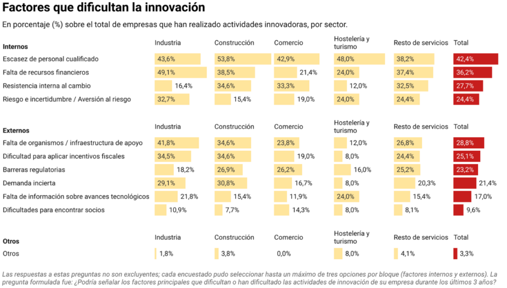 - Las principales barreras identificadas por las empresas que han realizado actividades innovadoras son la escasez de personal cualificado (42,4%) y la falta de recursos financieros (36,2%)